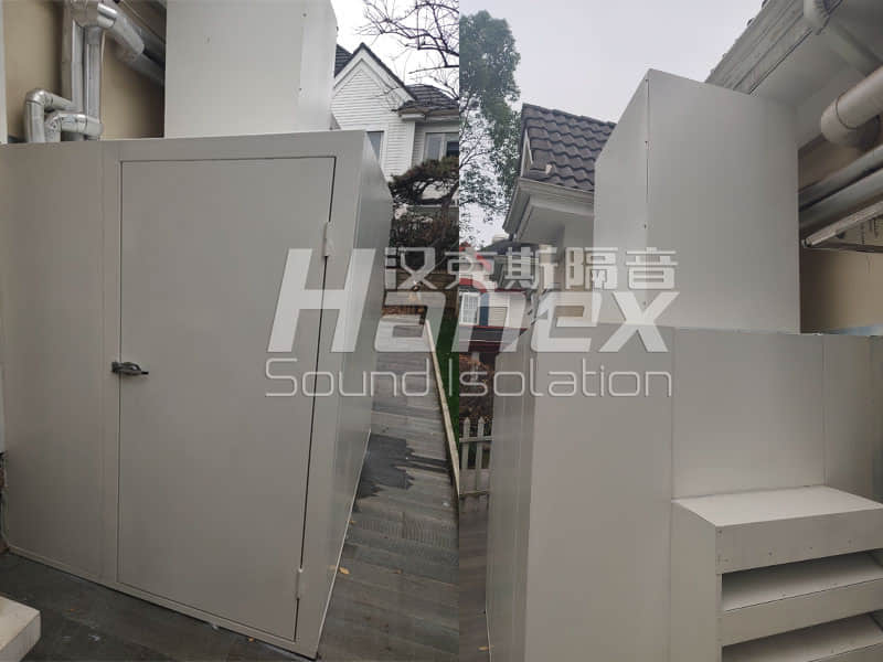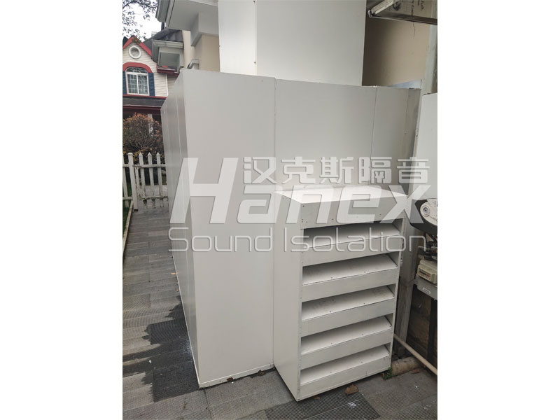 隔聲罩左方安裝設備檢修門,方便人員進出,右側安裝一臺通風消聲器,保證設備通風散熱的正常。頂部安裝一臺排風消聲器。隔聲罩背面靠墻處安裝吸聲層。
