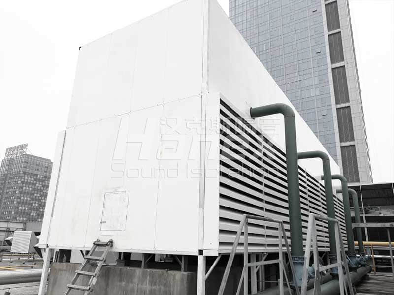 1、經(jīng)過漢克斯隔音技術(shù)人員現(xiàn)場踏勘及結(jié)合業(yè)主所提供的資料,裙房屋面上T4冷卻塔設計安裝隔聲棚。