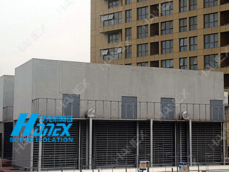 德盈廣場東面3組冷卻塔設備正常運行產生90-95分貝噪聲,對周邊公寓、酒店、辦公區造成不良影響。漢克斯隔音設計1.冷卻塔出風口消聲器,2.冷卻塔四周安裝吸隔聲屏障,工程結束后敏感區噪聲測量值低于45分貝。